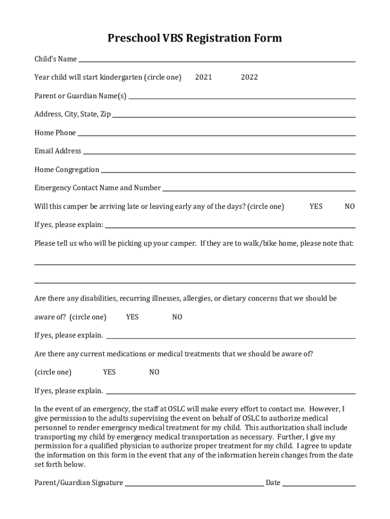 Preschool VBS Registration Form Child's Name Year child will start kindergarten (circle one)20212022Parent or Guardian Name(s) Address, City, State, Zip Home Phone Email Address Home Congregation