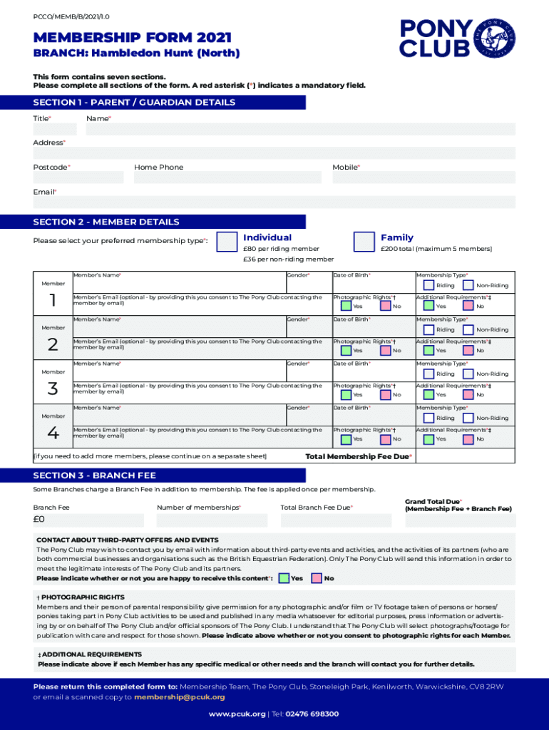 PCC/MEMO/B/2021/1.0MEMBERSHIP FORM 2021BRANCH: Wimbledon Hunt (North) This form contains seven sections. Please complete all sections of the form. A red asterisk (*) indicates a mandatory field. SECTION