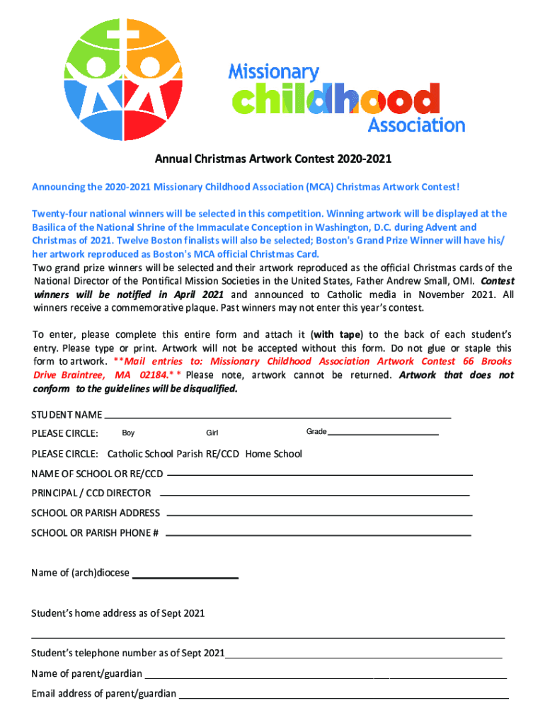 Annual Christmas Artwork Contest 20202021 Announcing the 20202021 Missionary Childhood Association (MCA) Christmas Artwork Contest! Twenty-four national winners will be selected in this competition.