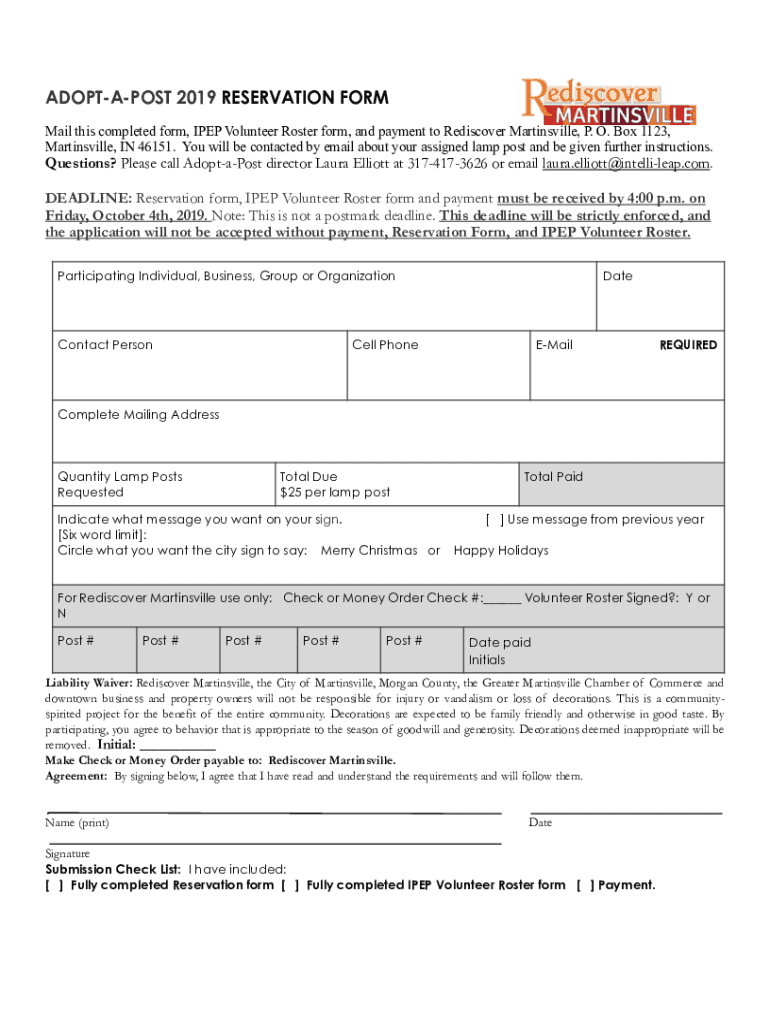 ADOPTAPOST 2019 RESERVATION FORM Mail this completed form, PEP Volunteer Roster form, and payment to Rediscover Martinsville, P. O. Box 1123, Martinsville, IN 46151. You will be contacted by email