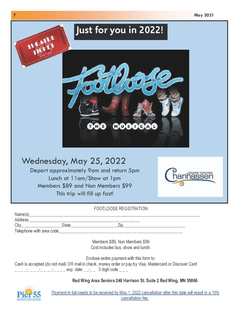 7May 2021Just for you in 2022! Wednesday, May 25, 2022Depart approximately 9am and return 5pm Lunch at 11am/Show at 1pm Members $89 and Non Members $99 This trip will fill up fast!FOOTLOOSE REGISTRATION