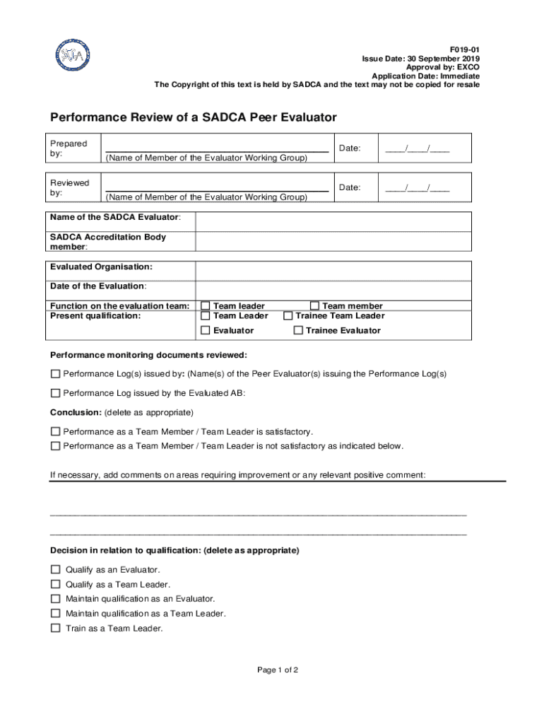 Get the free F019-01 Performance Review of a SADCA Peer Evaluator - September 2019