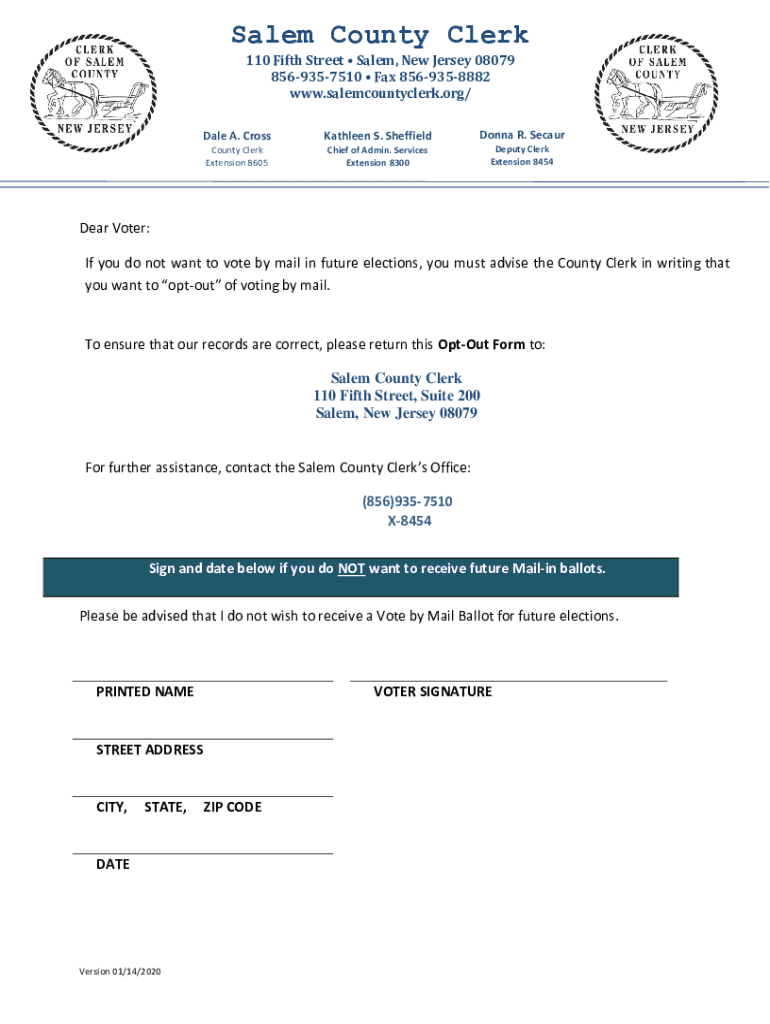 Salem County Clerk 110 Fifth Street Salem, New Jersey 08079 8569357510 Fax 8569358882 www.salemcountyclerk.org/ Dale A. Cross Kathleen S. Sheffield Donna R. SecaurCounty Clerk Extension 8605Chief