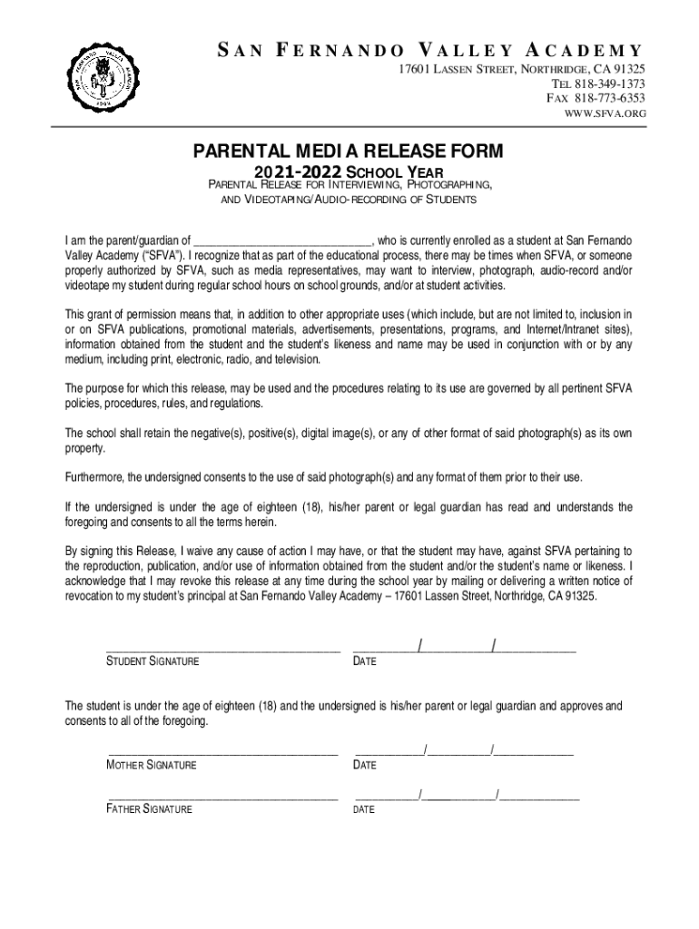 SAN FERNANDO VALLEY ACADEMY 17601 LASSEN STREET, NORTHRIDGE, CA 91325 TEL 8183491373 FAX 8187736353 WWW.SIVA.ORNAMENTAL MEDIA RELEASE FORM 20212022 SCHOOL YEAR PARENTAL RELEASE FOR INTERVIEWING, PHOTOGRAPHING,