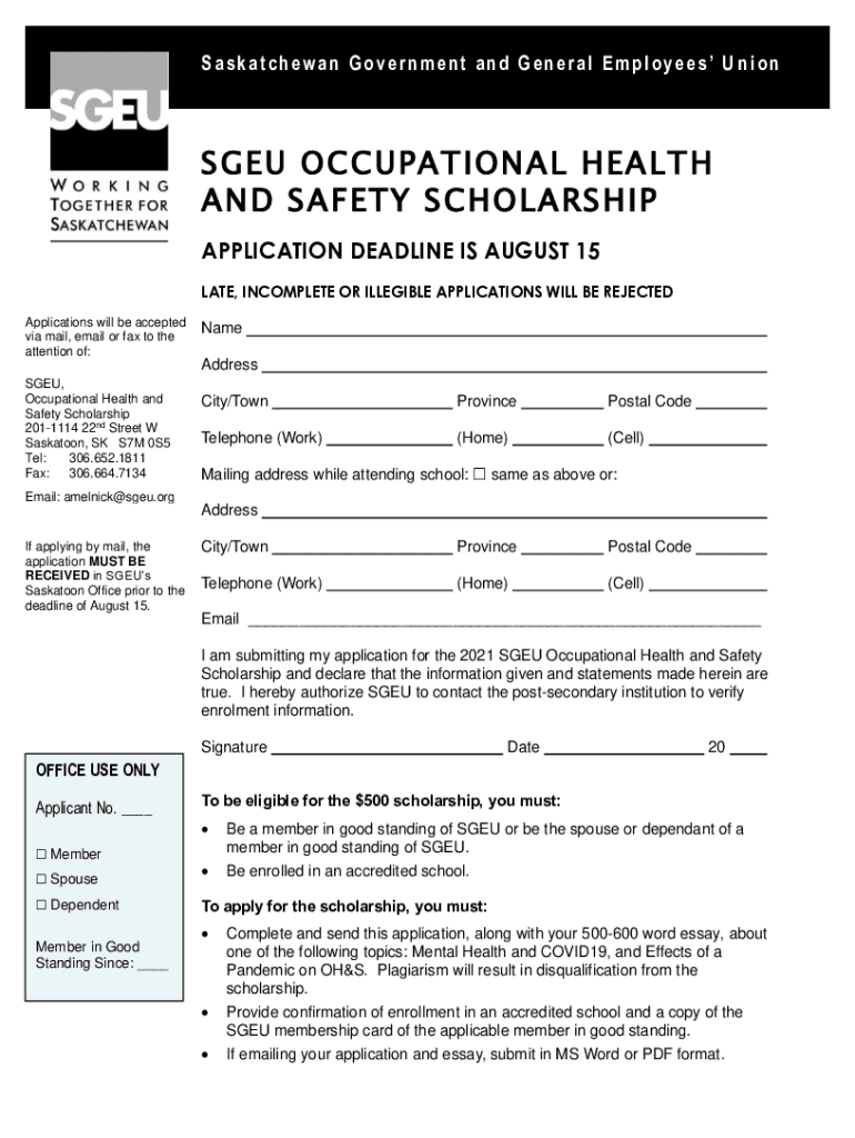 Saskatchewan Government and General Employees U nonage OCCUPATIONAL HEALTH AND SAFETY SCHOLARSHIP APPLICATION DEADLINE IS AUGUST 15 LATE, INCOMPLETE OR ILLEGIBLE APPLICATIONS WILL BE REJECTED Applications