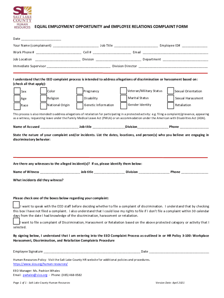 EQUAL EMPLOYMENT OPPORTUNITY and EMPLOYEE RELATIONS COMPLAINT FORM Date Your Name (complainant) Job Title Employee ID# Work Phone # Cell # Email Job Location Division Department Immediate Supervisor