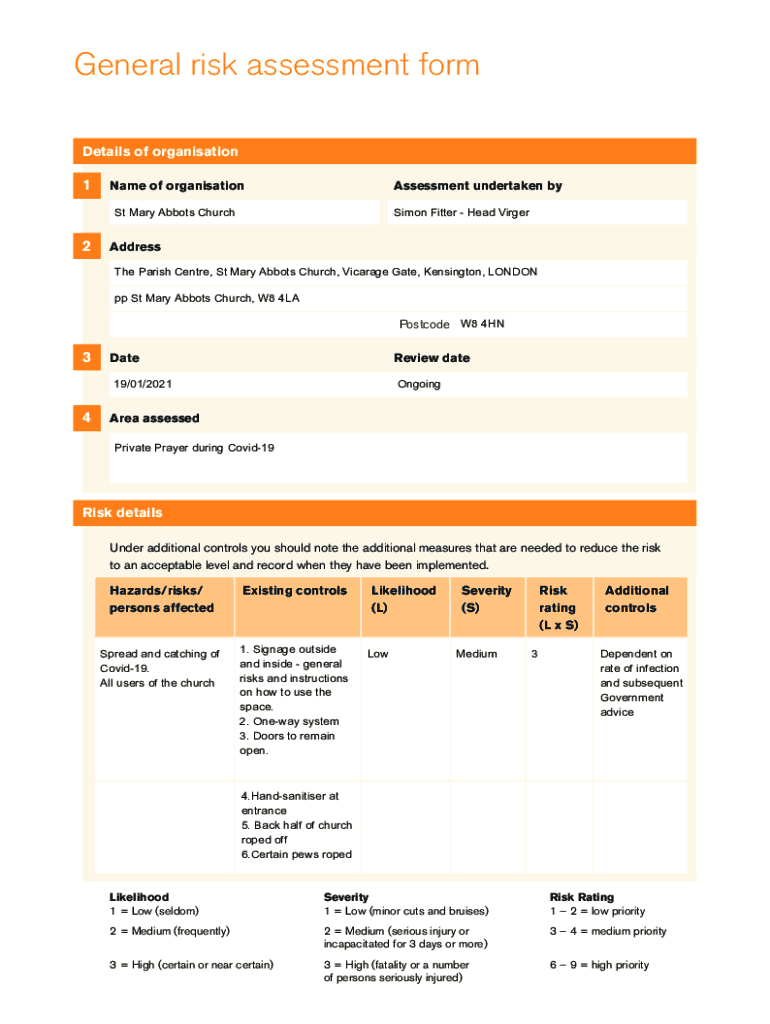 General risk assessment form Details of organisation1Name of organisationAssessment undertaken the best Mary Abbots Church2Simon Fitter Head VirgerAddress The Parish Center, St Mary Abbots Church,