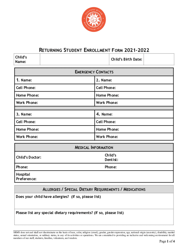 RETURNING STUDENT ENROLLMENT FORM 20212022 Childs Name:Child's Birth Date:EMERGENCY CONTACTS 1. Name:2. Name:Cell Phone:Cell Phone:Home Phone:Home Phone:Work Phone:Work Phone:3. Name:4. Name:Cell