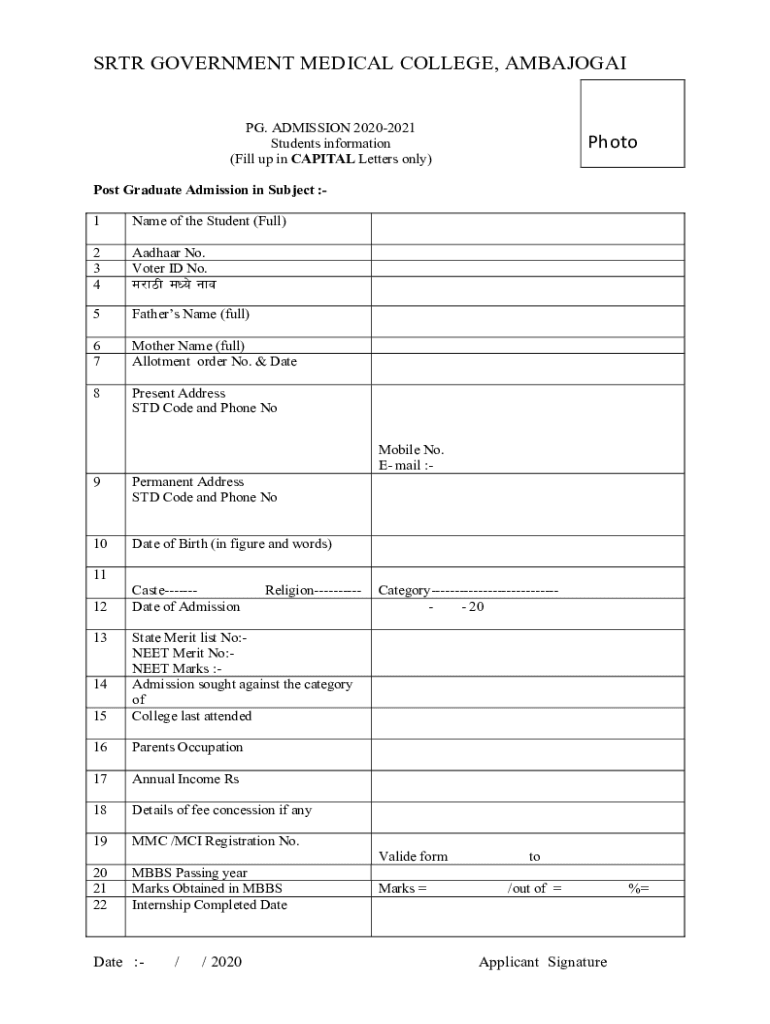 SRT GOVERNMENT MEDICAL COLLEGE, AMBAJOGAIPG. ADMISSION 20202021 Students information (Fill up in CAPITAL Letters only)PhotoPost Graduate Admission in Subject :1Name of the Student (Full)2 3 4Aadhaar