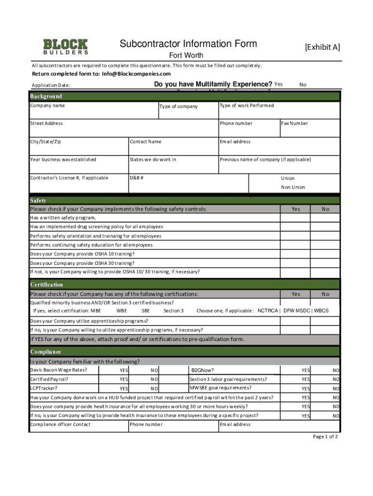 Subcontractor Information Form SUBCONTRACTOR PREQUALIFICATION FORM[Exhibit A]Fort Worth All subcontractors are required to complete this questionnaire. This form must be filled out completely. Return