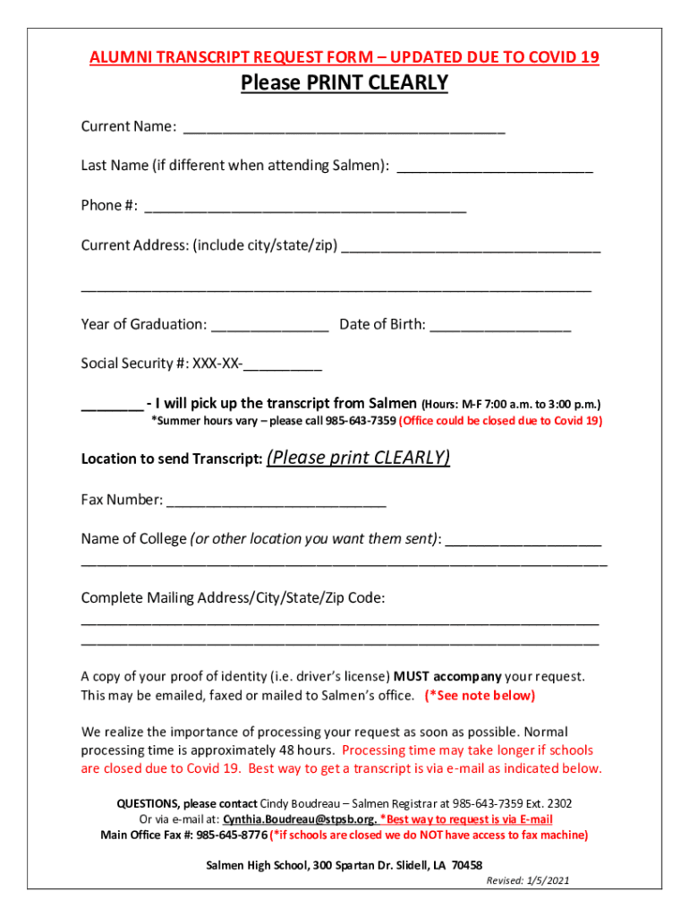 ALUMNI TRANSCRIPT REQUEST FORM UPDATED DUE TO COVID-19 19Please PRINT CLEARLY Current Name: Last Name (if different when attending Salmon): Phone #: Current Address: (include city/state/zip) Year