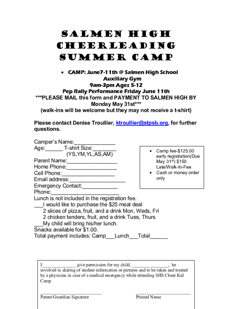 SALMON HIGH CHEERLEADING SUMMER CAMP: June711th Salmon High School Auxiliary Gym 9am3pm Ages 512 Pep Rally Performance Friday, June 11th ***PLEASE MAIL this form and PAYMENT TO SALMON HIGH BY Monday,