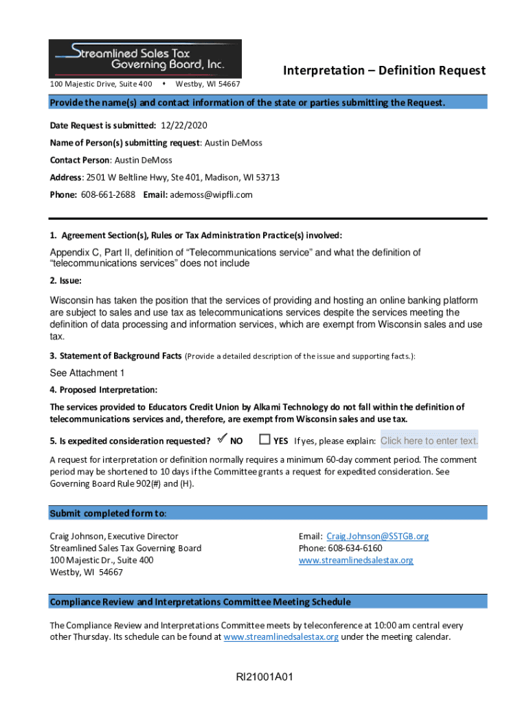 100 Majestic Drive, Suite 400Interpretation Definition RequestWestby, WI 54667Provide the name(s) and contact information of the state or parties submitting the Request. Date Request is submitted: