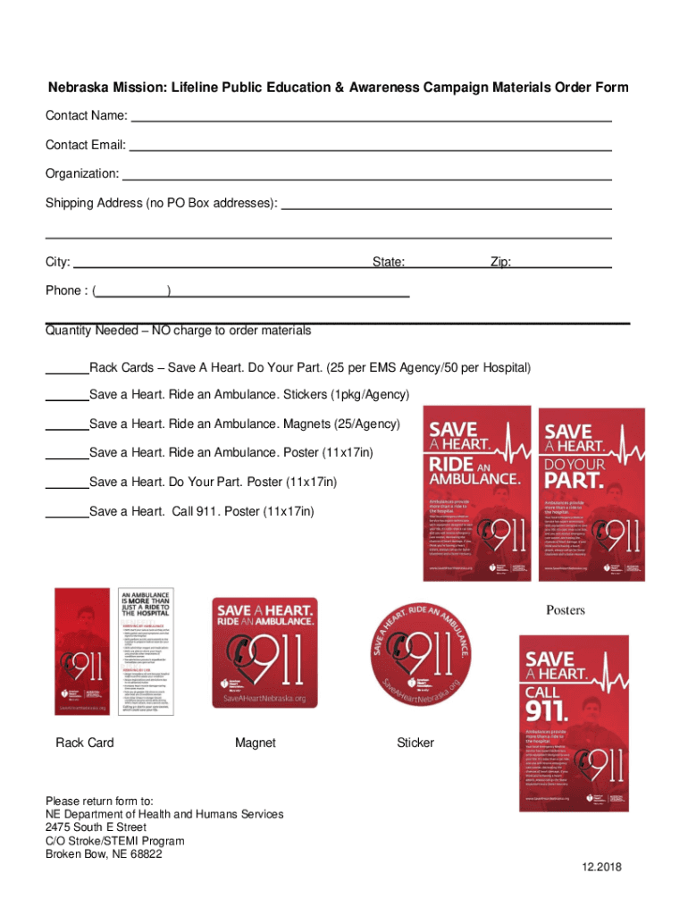 Nebraska Mission: Lifeline Public Education & Awareness Campaign Materials Order Form Contact Name: Contact Email: Organization: Shipping Address (no PO Box addresses):City:State:Phone : (Zip:) Quantity