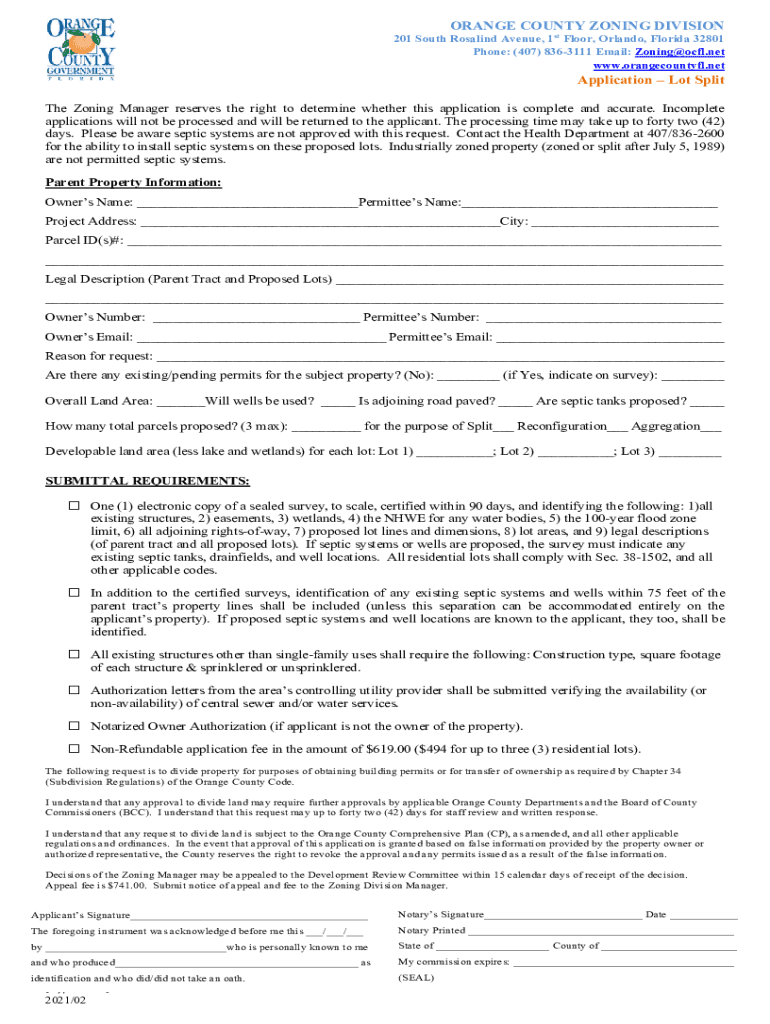 ORANGE COUNTY ZONING DIVISION 201 South Rosalind Avenue, 1st Floor, Orlando, Florida 32801 Phone: (407) 8363111 Email: Zoning@ocfl.net www.orangecountyfl.netApplication Lot Split The Zoning Manager