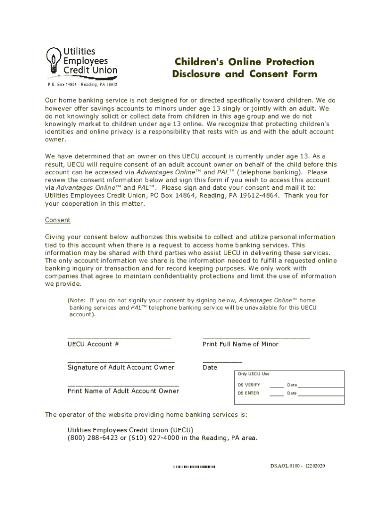Children's Online Protection Disclosure and Consent Form Our home banking service is not designed for or directed specifically toward children. We do however offer savings accounts to minors under