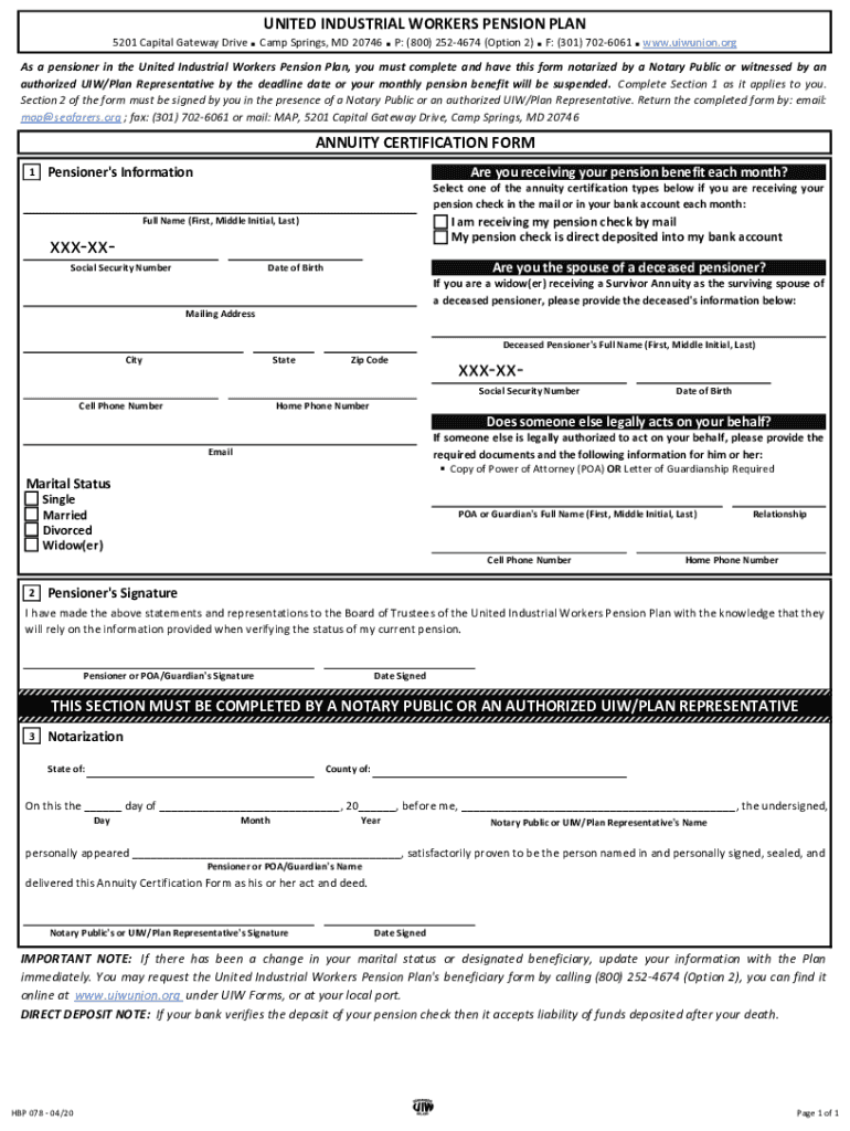 UNITED INDUSTRIAL WORKERS PENSION PLAN 5201 Capital Gateway Drive Camp Springs, Maryland 207464275 (301) 8990675 Margaret R. Bowen Administrator August 15, 2019, Re: 2019 Annuity Certification Dear