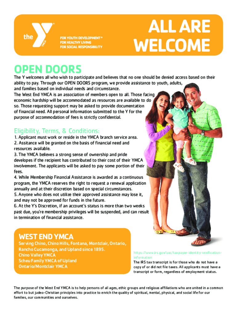 ALL ARE WELCOME OPEN Doorstep Y welcomes all who wish to participate and believes that no one should be denied access based on their ability to pay. Through our OPEN DOORS program, we provide assistance