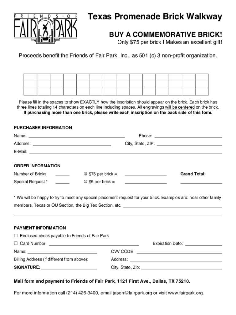Texas Promenade Brick Walkway BUY A COMMEMORATIVE BRICK! Only $75 per brick Makes an excellent gift! Proceeds benefit the Friends of Fair Park, Inc., as 501 (c) 3 nonprofit organization. Please fill