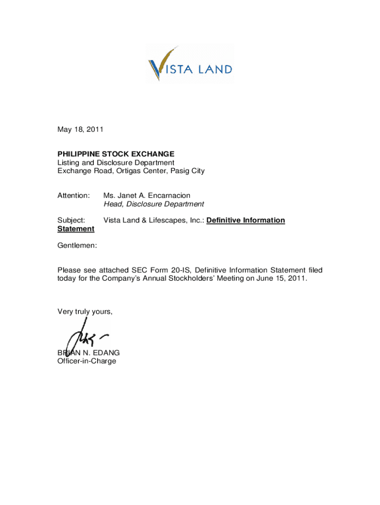 May 18, 2011PHILIPPINE STOCK EXCHANGE Listing and Disclosure Department Exchange Road, Ortega Center, PSIG Inattention:Ms. Janet A. Incarnation Head, Disclosure DepartmentSubject: StatementVista Land