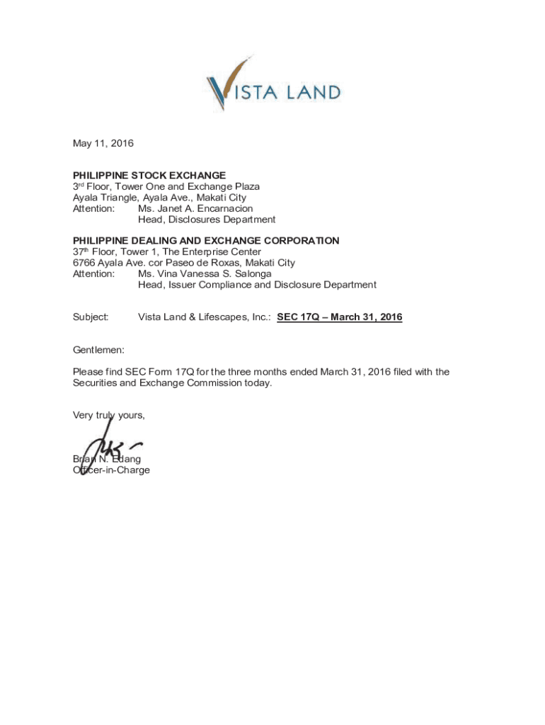 May 11, 2016, PHILIPPINE STOCK EXCHANGE 3rd Floor, Tower One and Exchange Plaza Ayala Triangle, Ayala Ave., Marathi City Attention: Ms. Janet A. Incarnation Head, Disclosures Department PHILIPPINE