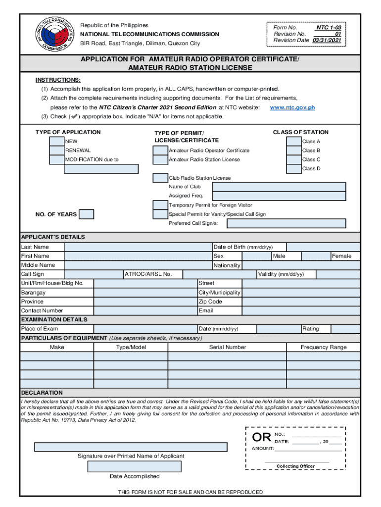 Republic of the PhilippinesForm No. NTC 103 Revision No. 01 Revision Date 03/31/2021NATIONAL TELECOMMUNICATIONS COMMISSION BIR Road, East Triangle, Dalian, Quezon Misapplication FOR AMATEUR RADIO