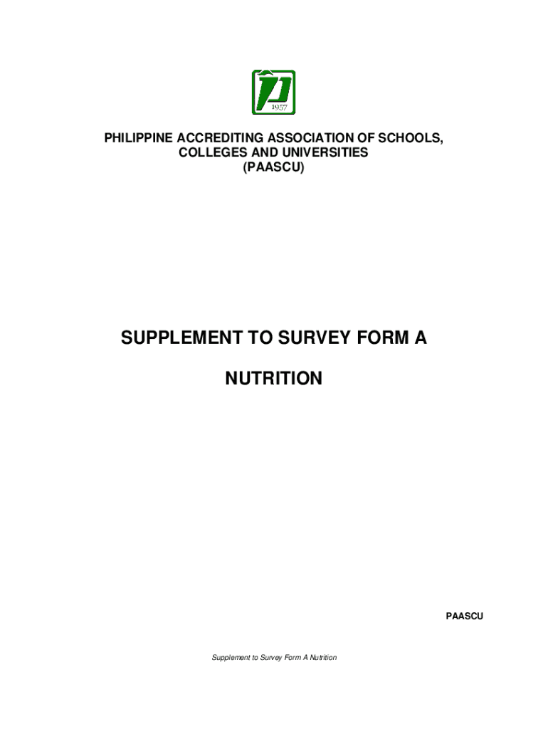 PHILIPPINE ACCREDITING ASSOCIATION OF SCHOOLS, COLLEGES AND UNIVERSITIES (PASCO)SUPPLEMENT TO SURVEY FORM A NUTRITIONPAASCUSupplement to Survey Form A Nutrition Philippine Accrediting Association