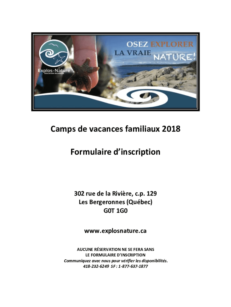 Camps DE vacancies familiar 2018 Formula ire dinscription302 rue DE la Riv ire, c.p. 129 Les Bergeron (Quebec) G0T 1G0 www.explosnature.ca ACUTE RESERVATION NE SEF ERA SANS LE FORMULA IRE INSCRIPTION