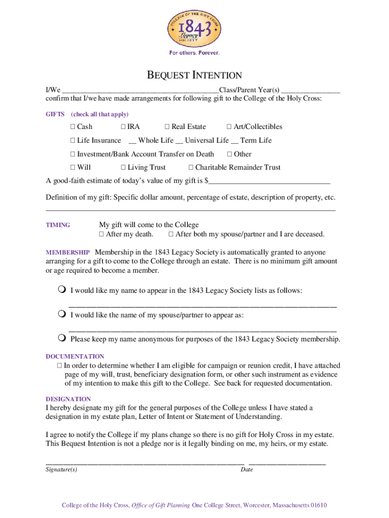 BEQUEST INTENTION I/We Class/Parent Year(s) confirm that I/we have made arrangements for following gift to the College of the Holy Cross: GIFTS(check all that apply)CashIRAReal Estate Art/CollectiblesLife