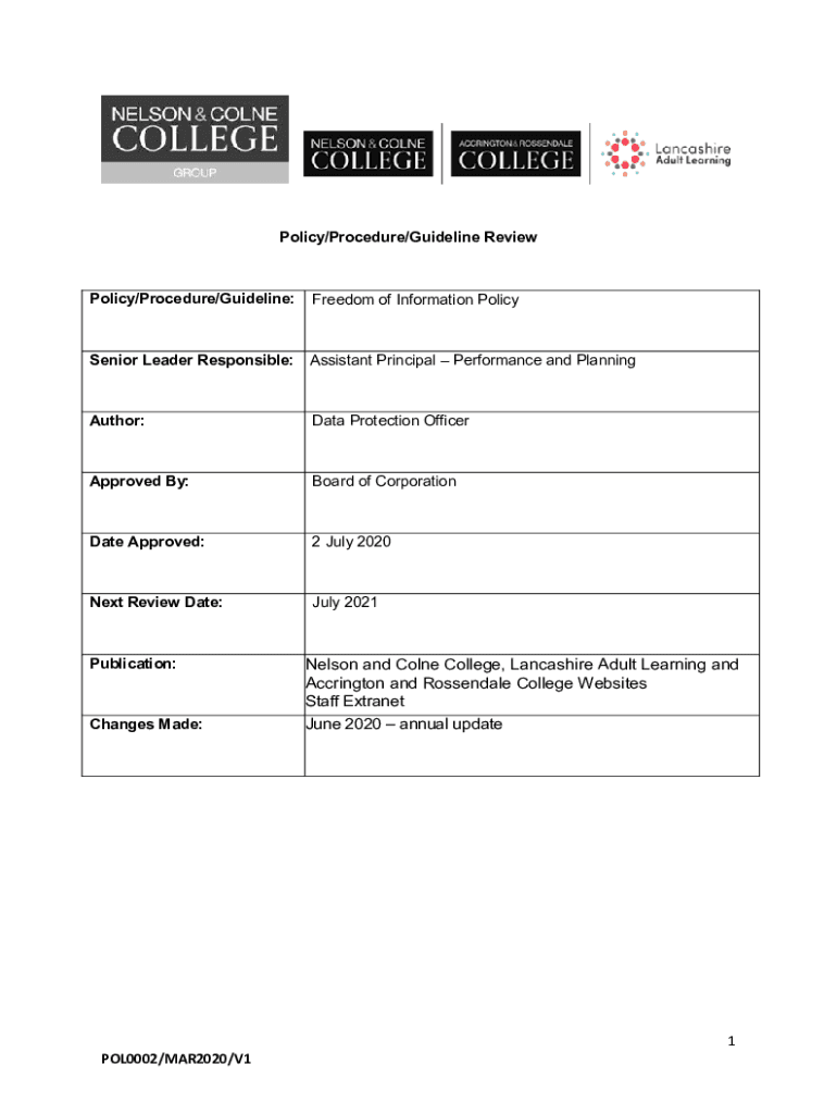 Policy/Procedure/Guideline ReviewPolicy/Procedure/Guideline:Freedom of Information Policy Senior Leader Responsible:Assistant Principal Performance and PlanningAuthor:Data Protection OfficerApproved