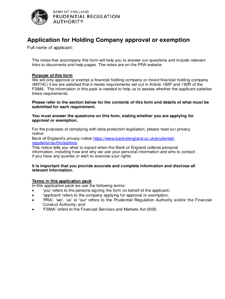 Application for Holding Company approval or exemption Full name of applicant: The notes that accompany this form will help you to answer our questions and include relevant links to documents and help