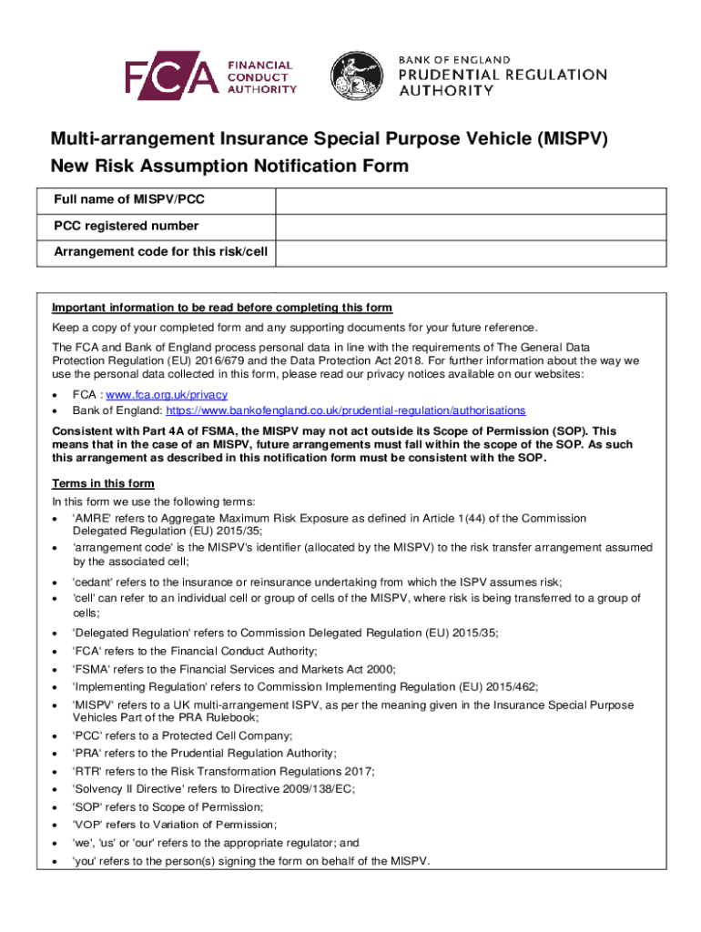 Multi arrangement Insurance Special Purpose Vehicle (MI SPV) New Risk Assumption Notification Form Full name of MI SPV/PCC registered number Arrangement code for this risk/cellImportant information