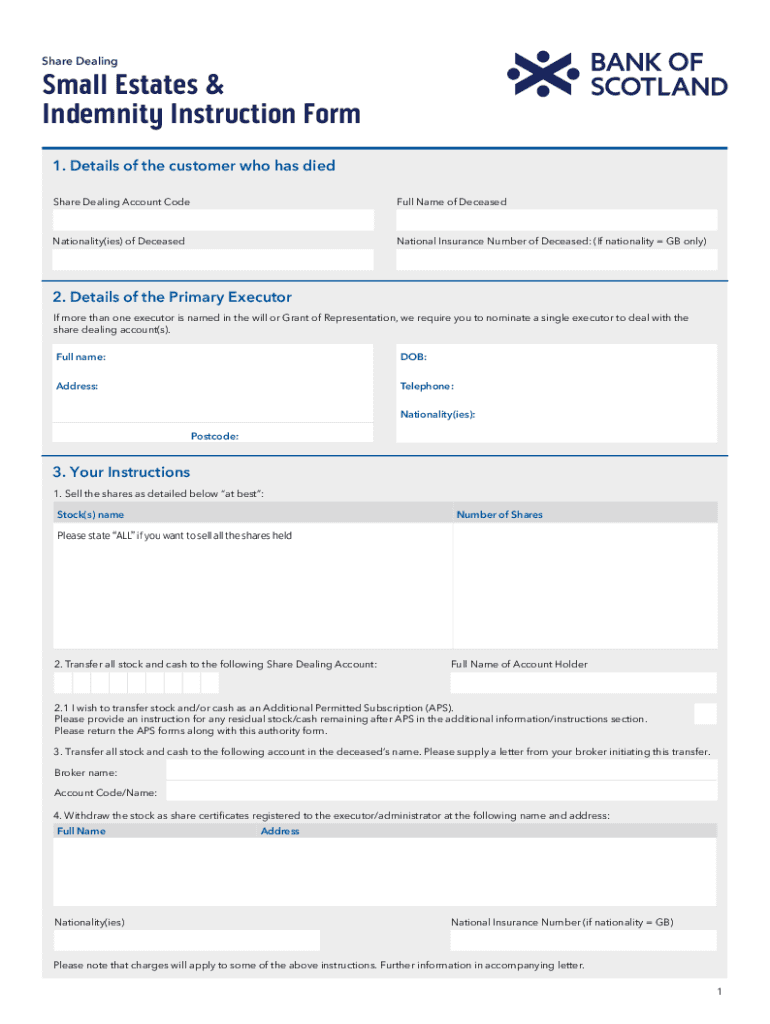 Get the free Share Dealing Small Estates & Indemnity Instruction Form