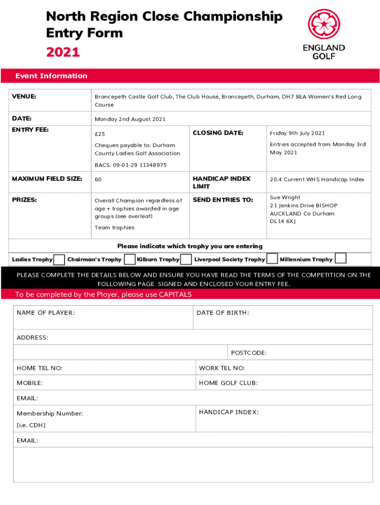 North Region Close Championship Entry Form 2021 Event Information VENUE:Bracelet Castle Golf Club, The Club House, Bracelet, Durham, DH7 8EA Women's Red Long Course DATE:Monday 2nd August 2021ENTRY