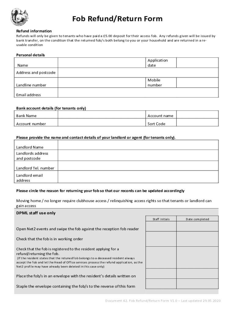 Fob Refund/Return Form Refund information Refunds will only be given to tenants who have paid a 5.00 deposit for their access fob. Any refunds given will be issued by bank transfer, on the condition