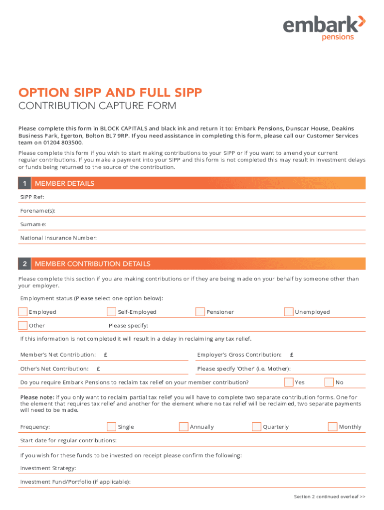 OPTION SIPP AND FULL SIPP CONTRIBUTION CAPTURE Formulas complete this form in BLOCK CAPITALS and black ink and return it to: Embark Pensions, Don't scar House, Eakins Business Park, Edgerton, Bolton