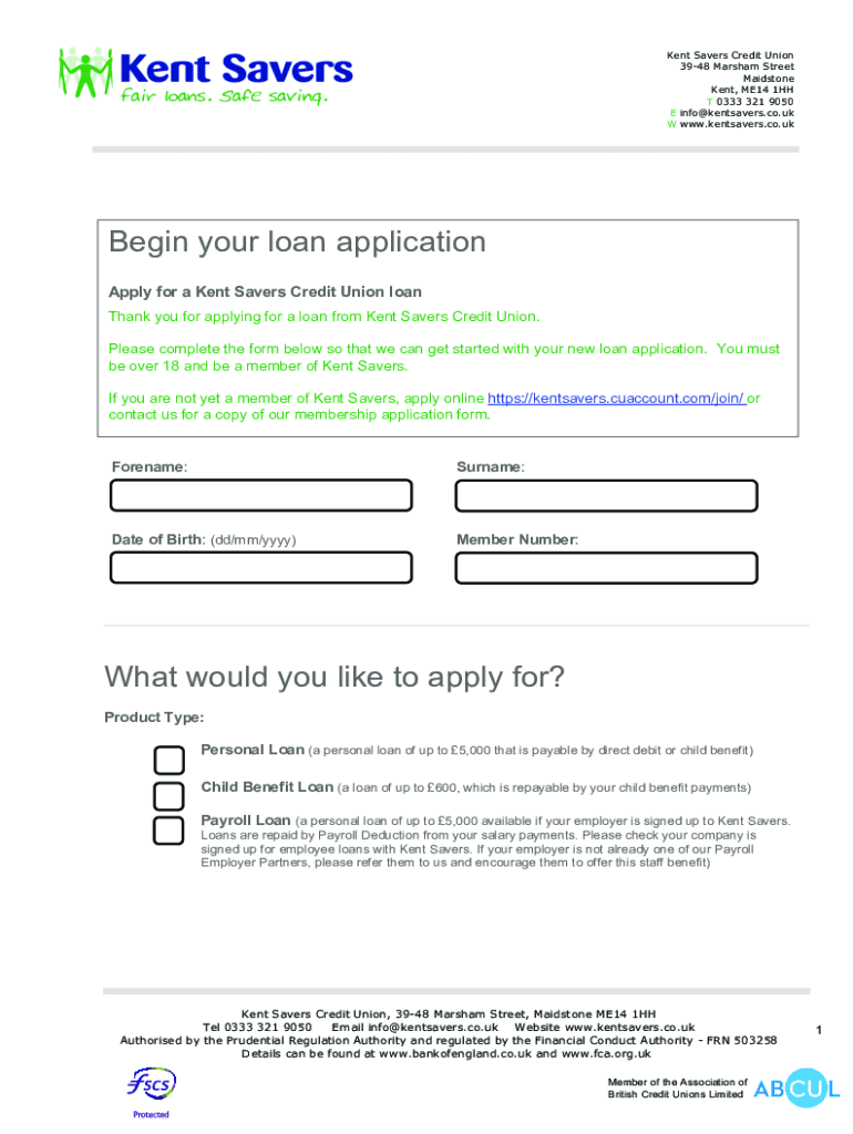 Kent Savers Credit Union 3948 Marshal Street Maidstone Kent, ME14 1HH T 0333 321 9050 E info@kentsavers.co.uk W www.kentsavers.co.ukBegin your loan application Apply for a Kent Savers Credit Union