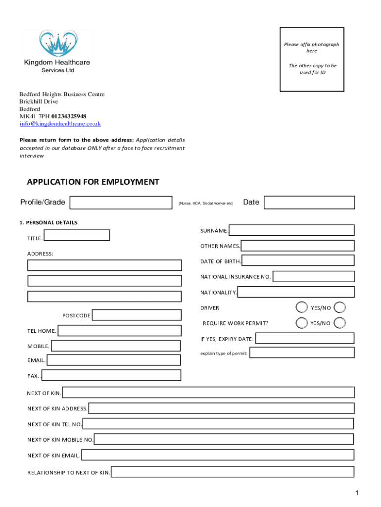 Please affix photograph here The other copy to be used for Bedford Heights Business Center Brick hill Drive Bedford MK41 7PH 01234325948 info@kingdomhealthcare.co.uk Please return form to the above