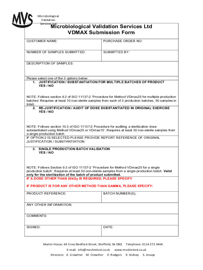 Microbiological Validation ServicesLtdMicrobiological Validation Services Ltd VDM AX Submission FormCUSTOMER NAME:PURCHASE ORDER NO:NUMBER OF SAMPLES SUBMITTED:SUBMITTED BY:DESCRIPTION OF SAMPLES:Please