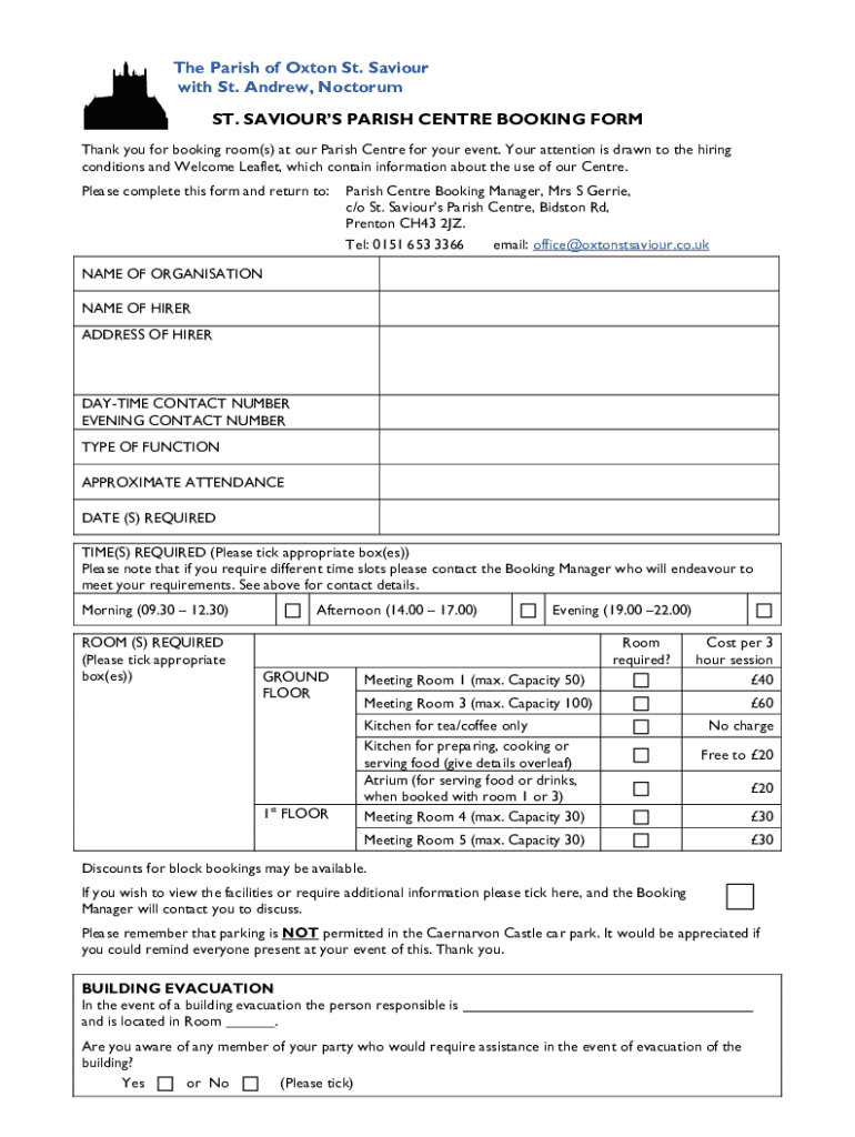 The Parish of Ox ton St. Savior with St. Andrew, Nostrum ST. Saviors PARISH Center BOOKING FORM Thank you for booking room(s) at our Parish Center for your event. Your attention is drawn to the hiring