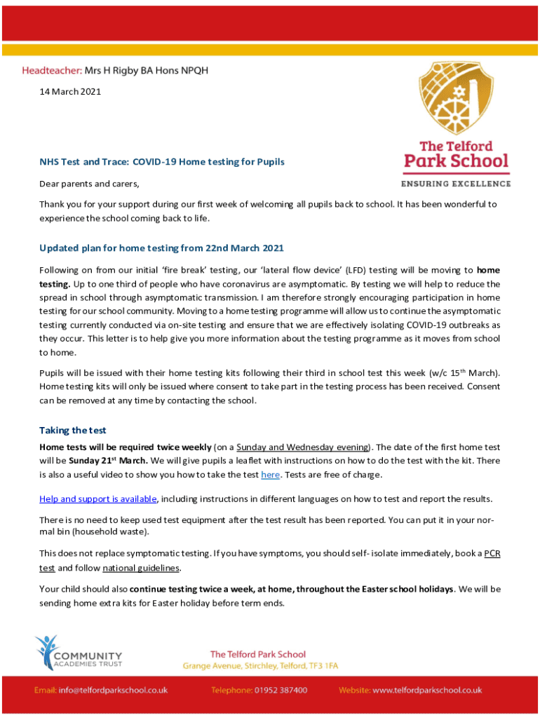 14 March 2021NHS Test and Trace: COVID-19 Home testing for Pupils Dear parents and carers, Thank you for your support during our first week of welcoming all pupils back to school. It has been wonderful