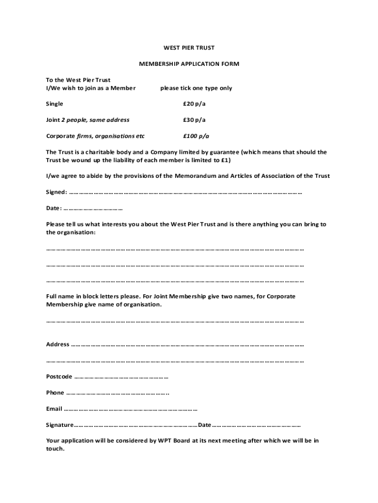 WEST PIER TRUSTMEMBERSHIP APPLICATION Form the West Pier Trust/We wish to join as a Member please tick one type onlySingle20 p/joint 2 people, same address30 p/corporate firms, organizations etc100