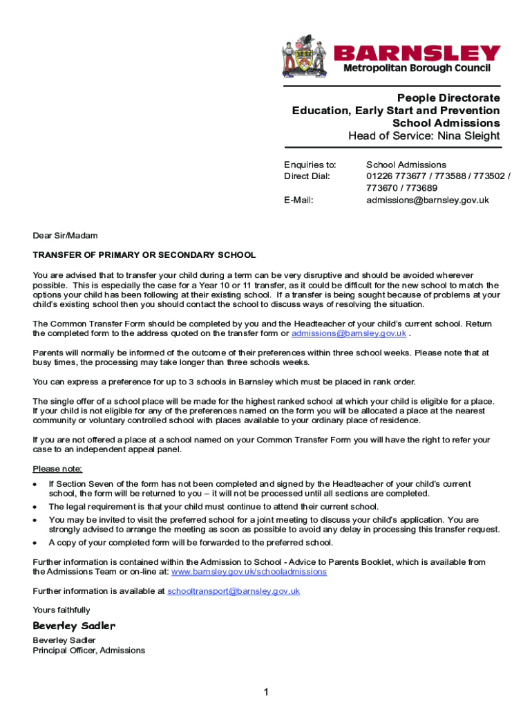 People Directorate Education, Early Start and Prevention School Admissions Head of Service: Nina Sleight Inquiries to: Direct Dial: Email:School Admissions 01226 773677 / 773588 / 773502 / 773670