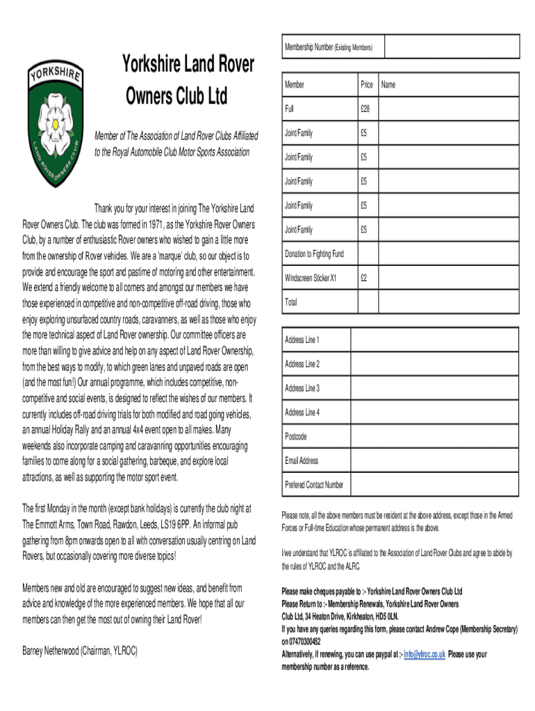 Membership Number (Existing Members)Yorkshire Land Rover Owners Club Ltd Member of The Association of Land Rover Clubs Affiliated to the Royal Automobile Club Motor Sports AssociationThank you for
