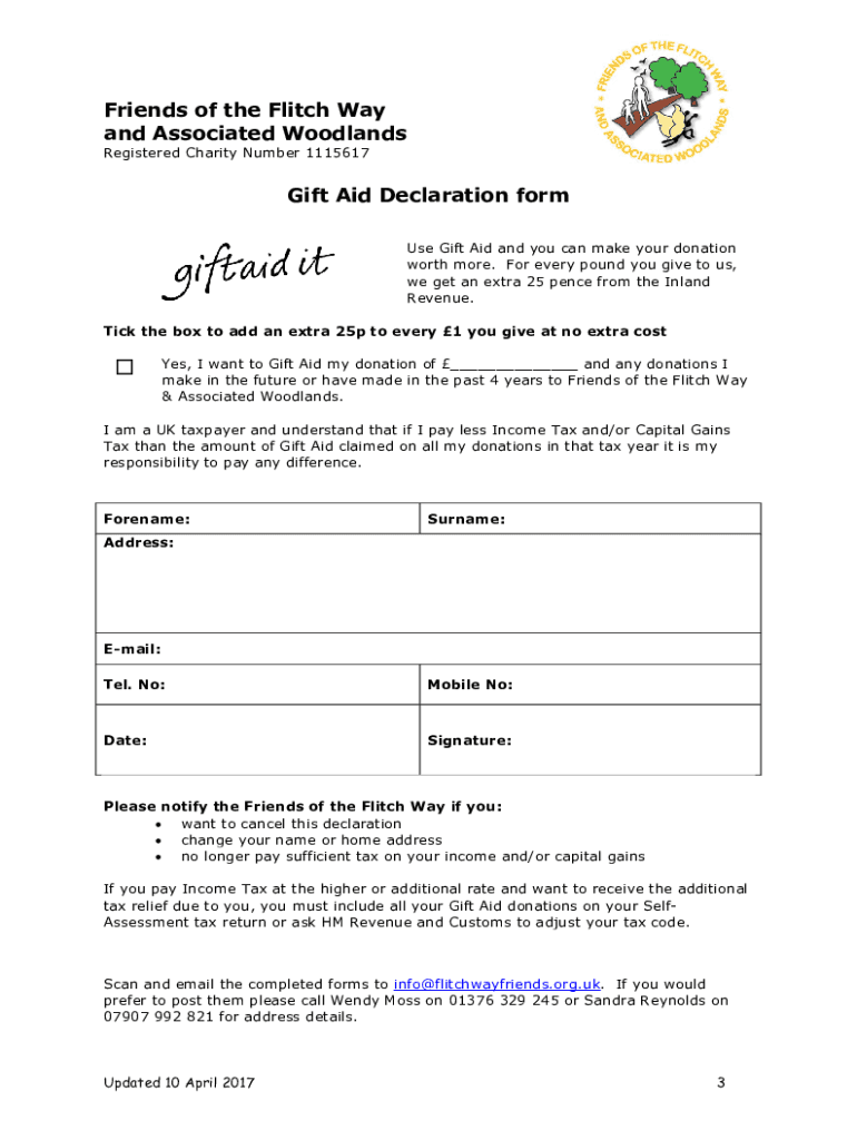 Friends of the Fitch Way and Associated Woodlands Registered Charity Number 1115617Gift Aid Declaration form Use Gift Aid and you can make your donation worth more. For every pound you give to us,