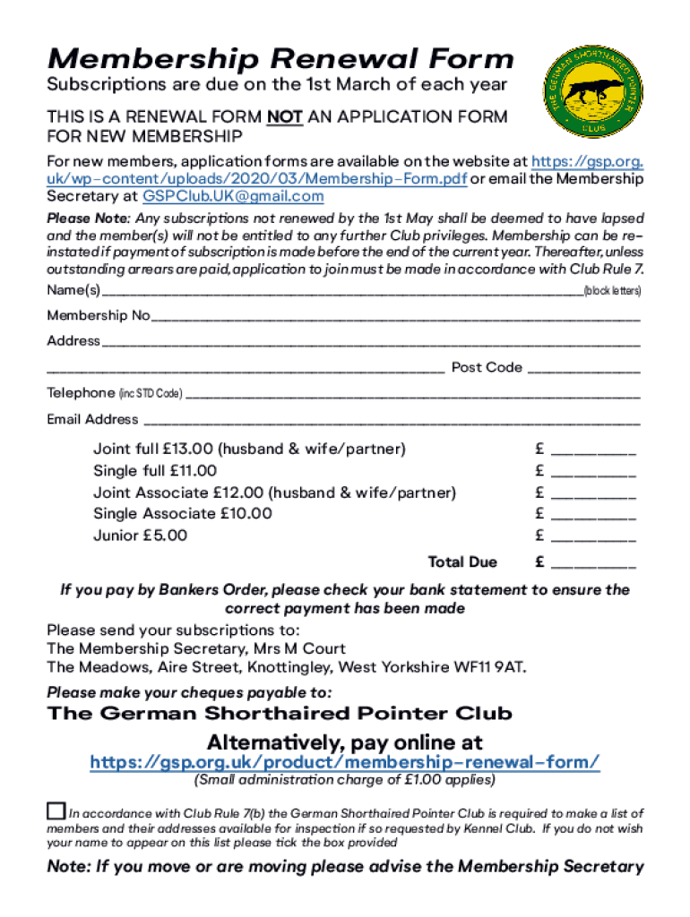Membership Renewal Form Subscriptions are due on the 1st March of each earth's IS A RENEWAL FORM NOT AN APPLICATION FORM FOR NEW MEMBERSHIP For new members, application forms are available on the