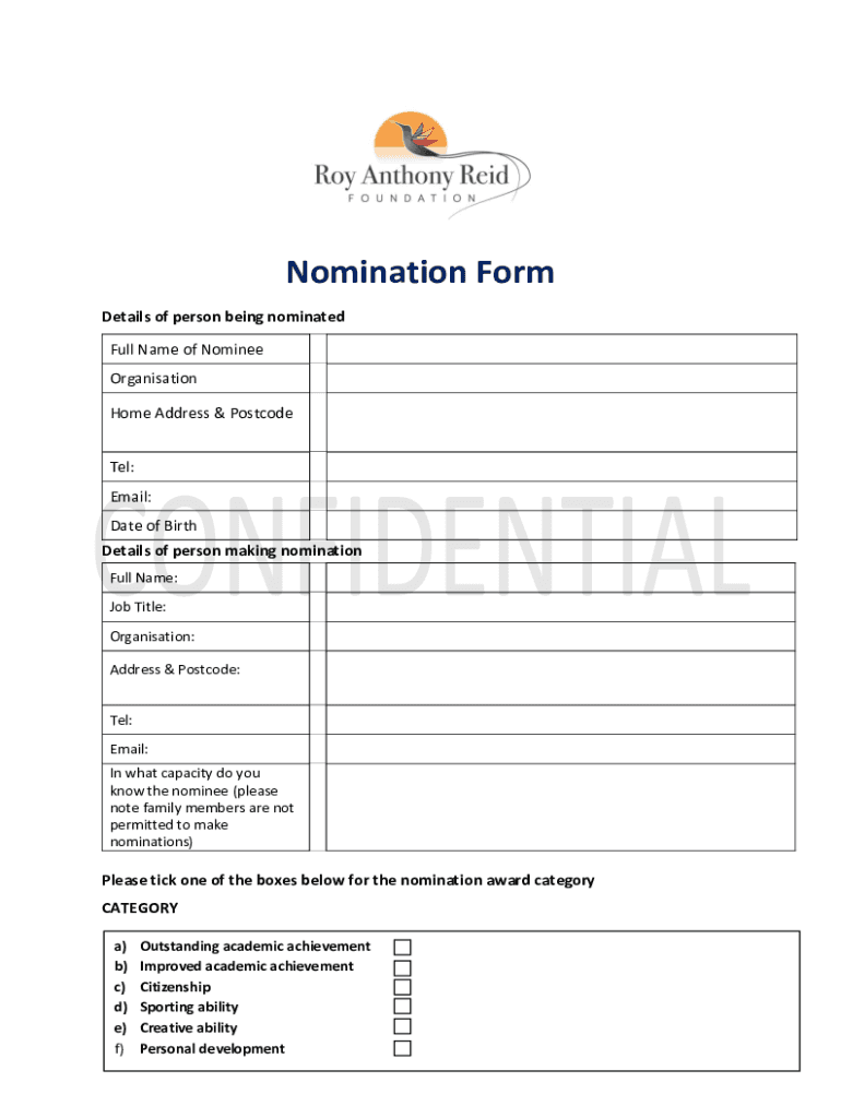 Nomination Form Details of person being nominated Full Name of Nominee Organization Home Address & Postcode Tel: Email: Date of Birth Details of person making nomination Full Name: Job Title: Organization: