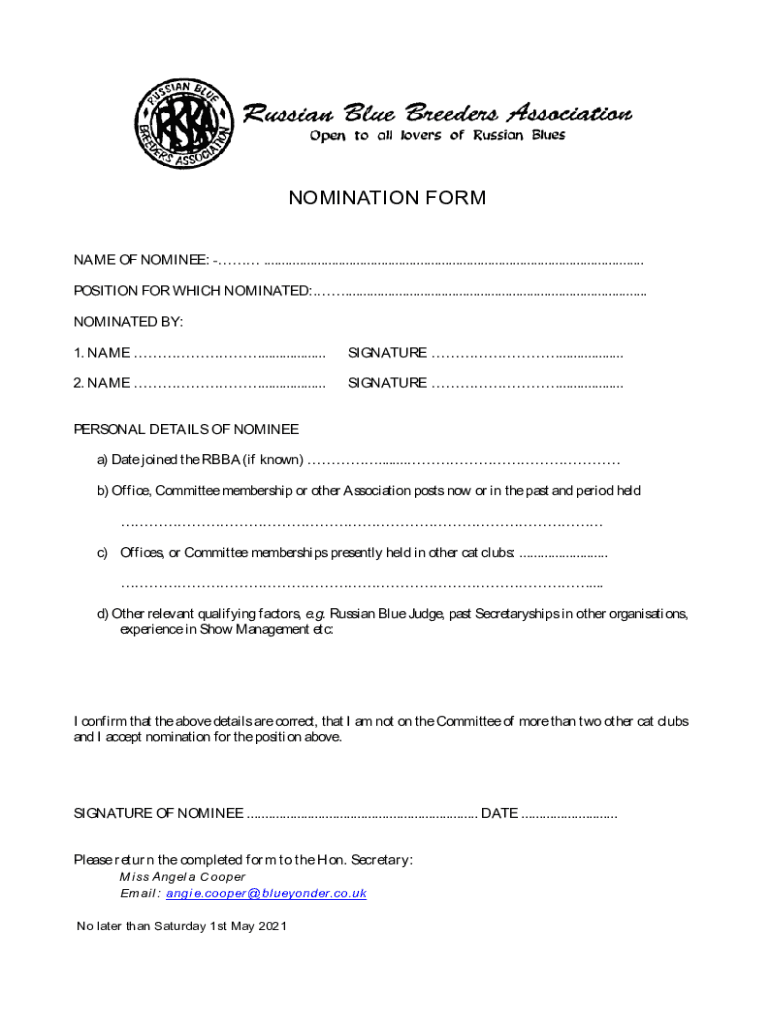Information such as the name of the nominee, their contact details, their eligibility to serve as a representative, and any other relevant information required by the society.