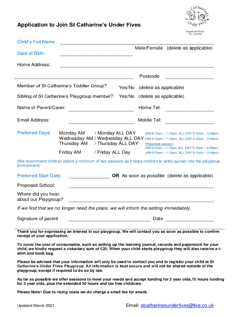 Application to Join St Catherine Under Fives Registered Charity No. 1051904Childs Full Name : Male/Female (delete as applicable) Date of Birth: Home Address: Postcode Member of St Catherine Toddler