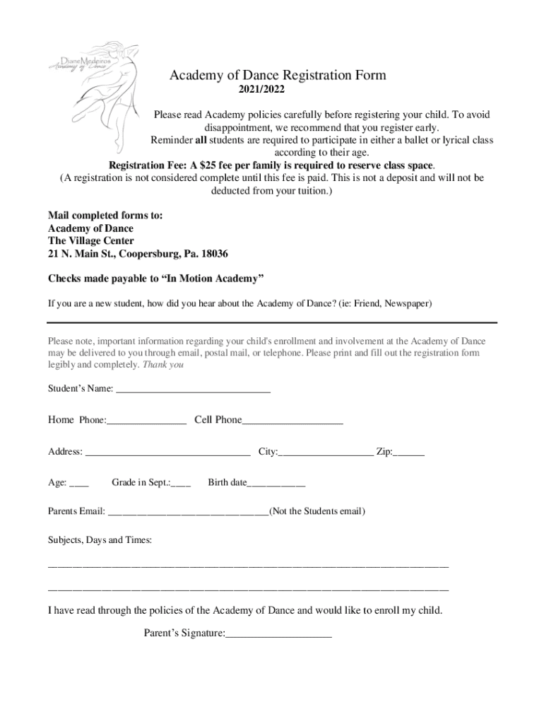 Academy of Dance Registration Form 2021/2022 Please read Academy policies carefully before registering your child. To avoid disappointment, we recommend that you register early. Reminder all students